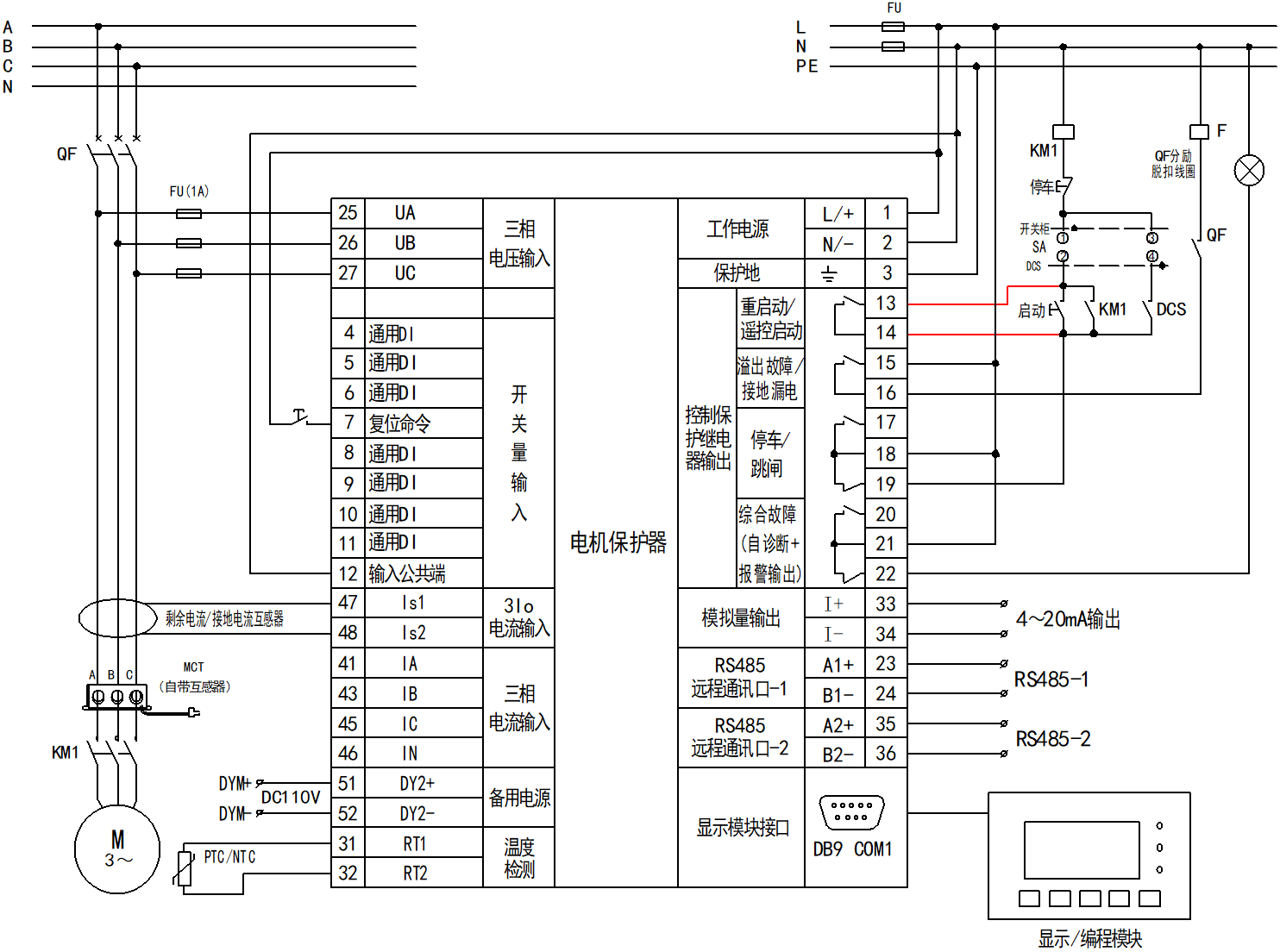 注2:圖中MCT為保護器自帶電流互感器,≤400A 電流規(guī)格保護器,三相主線路的電纜同方向一次穿芯,MCT引出線自帶的4芯端子直接插接到保護器的三相電流輸入端口(41#~46#);當電動機的額定電流>400A時,三相主線路的電纜預先一次穿過3個外部保護CT(P1進,P2出),將3個外部CT二次側(cè)5A電流線按定義接入到三相電流輸入端口(41#~46#),3個外部保護CT的S2端并接地。